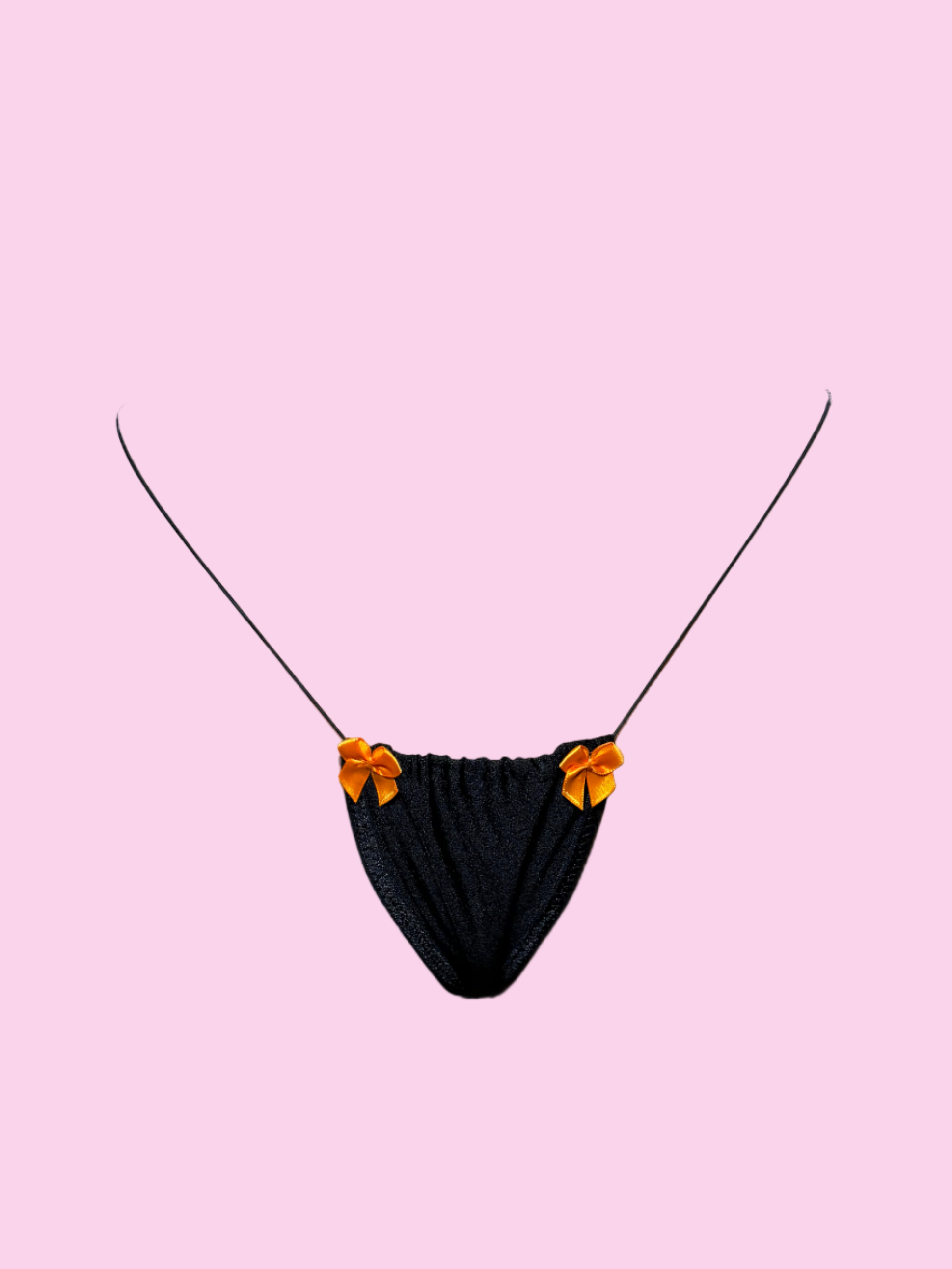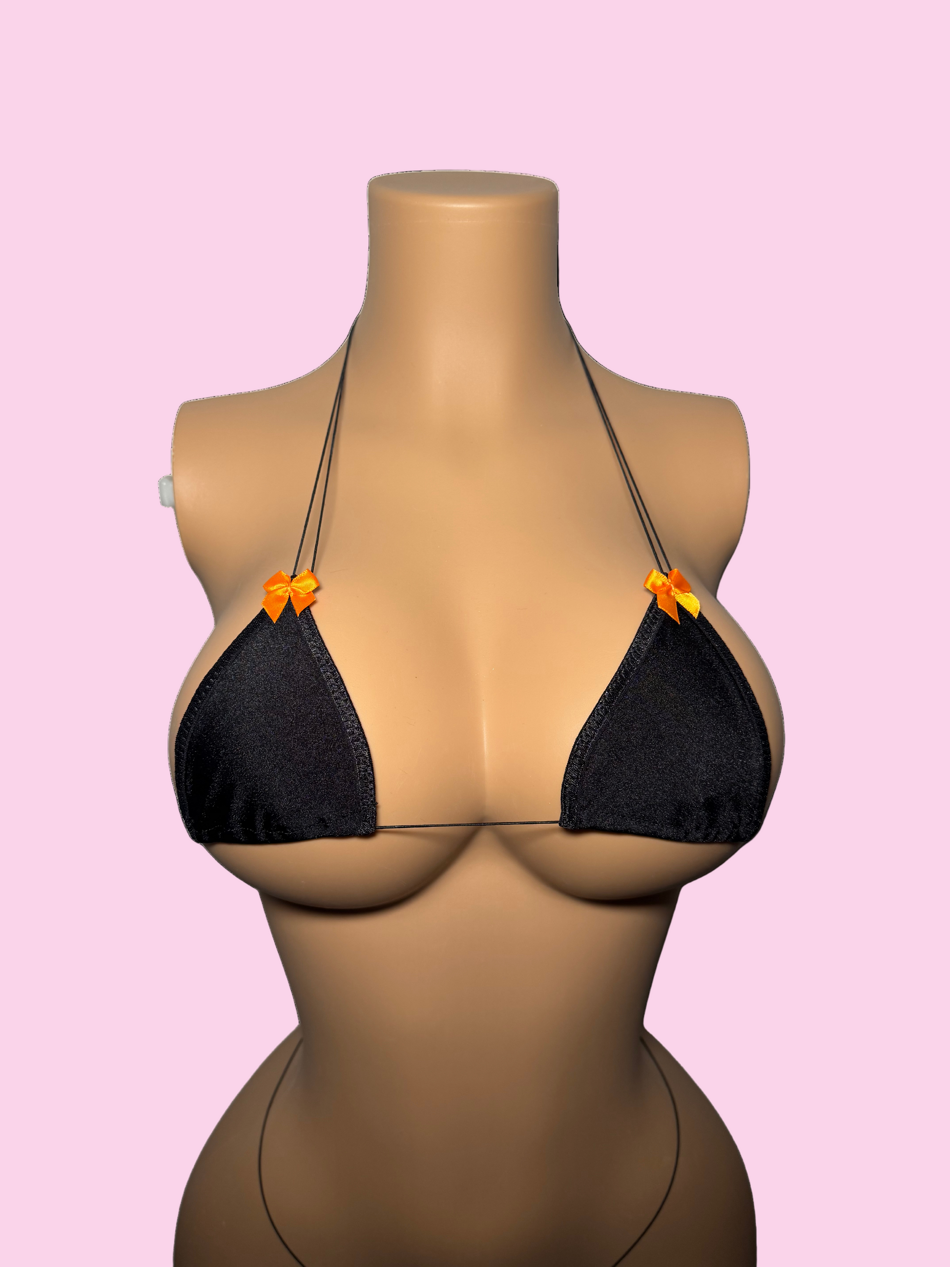 The Coraline 'kini is apart of our Halloween Collection and features orange bows on both top and bottom. Made with stretchy spandex fabric and durable elastic string.
