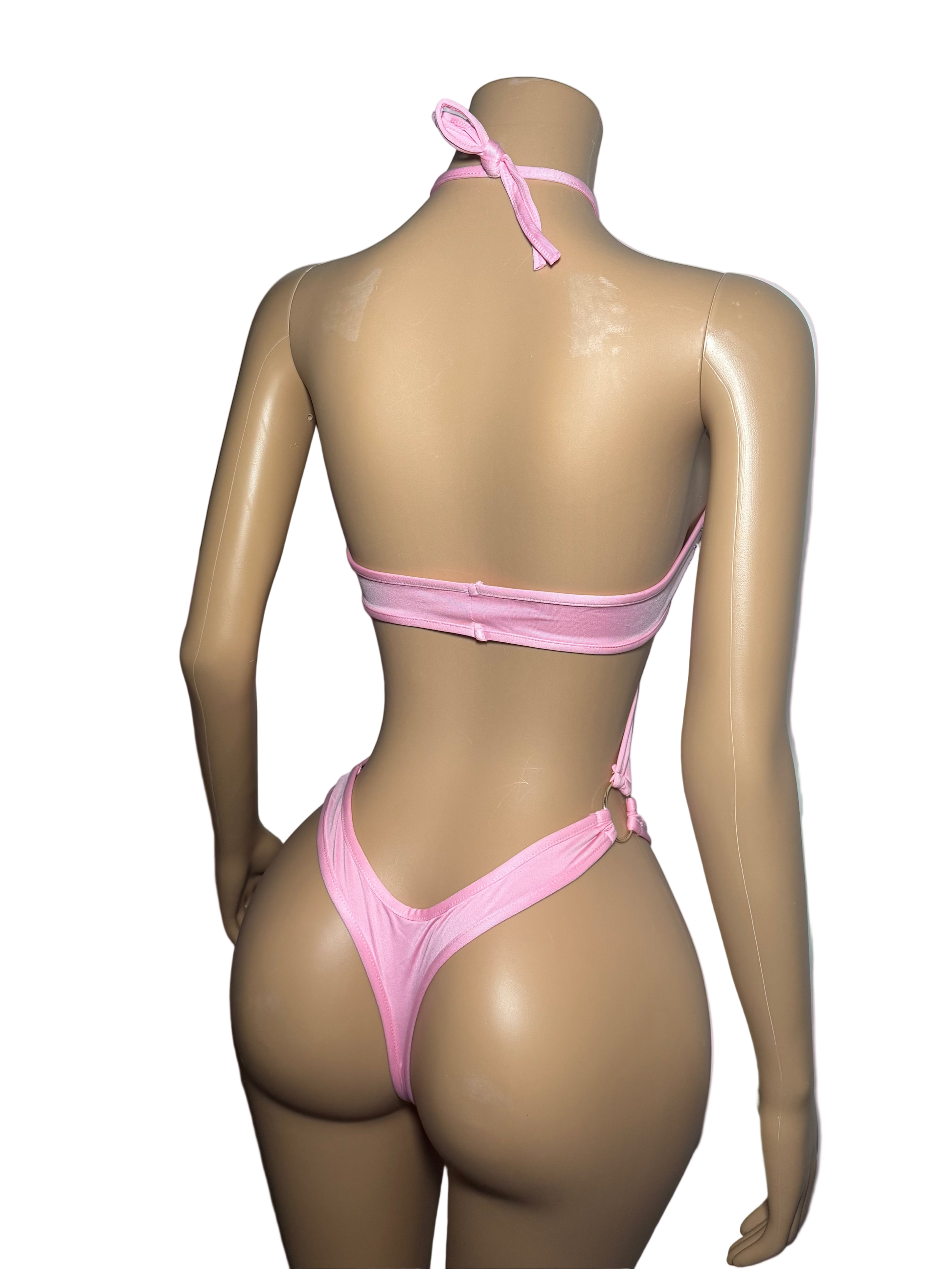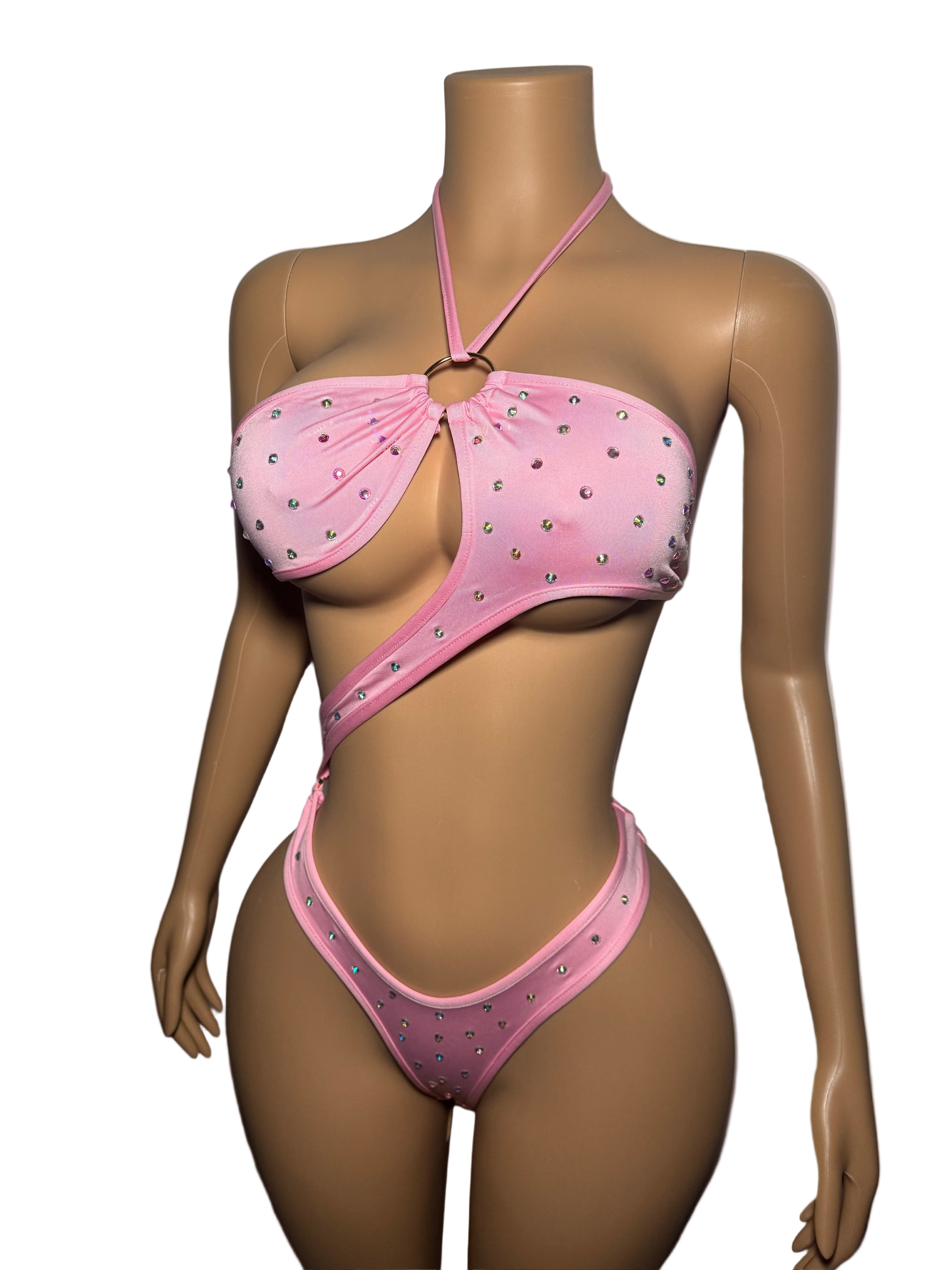 The Macie bodysuit features a halter top design covered in rhinestones. Made from stretchy spandex baby pink fabric.