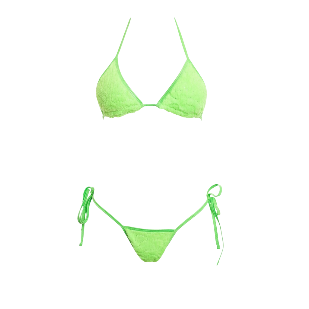 The Mrs. Grinch bikini features a furry green fabric with matching bikini top and scrunch-butt bottoms. The- The- The Grin- The Money Maker 🎄
