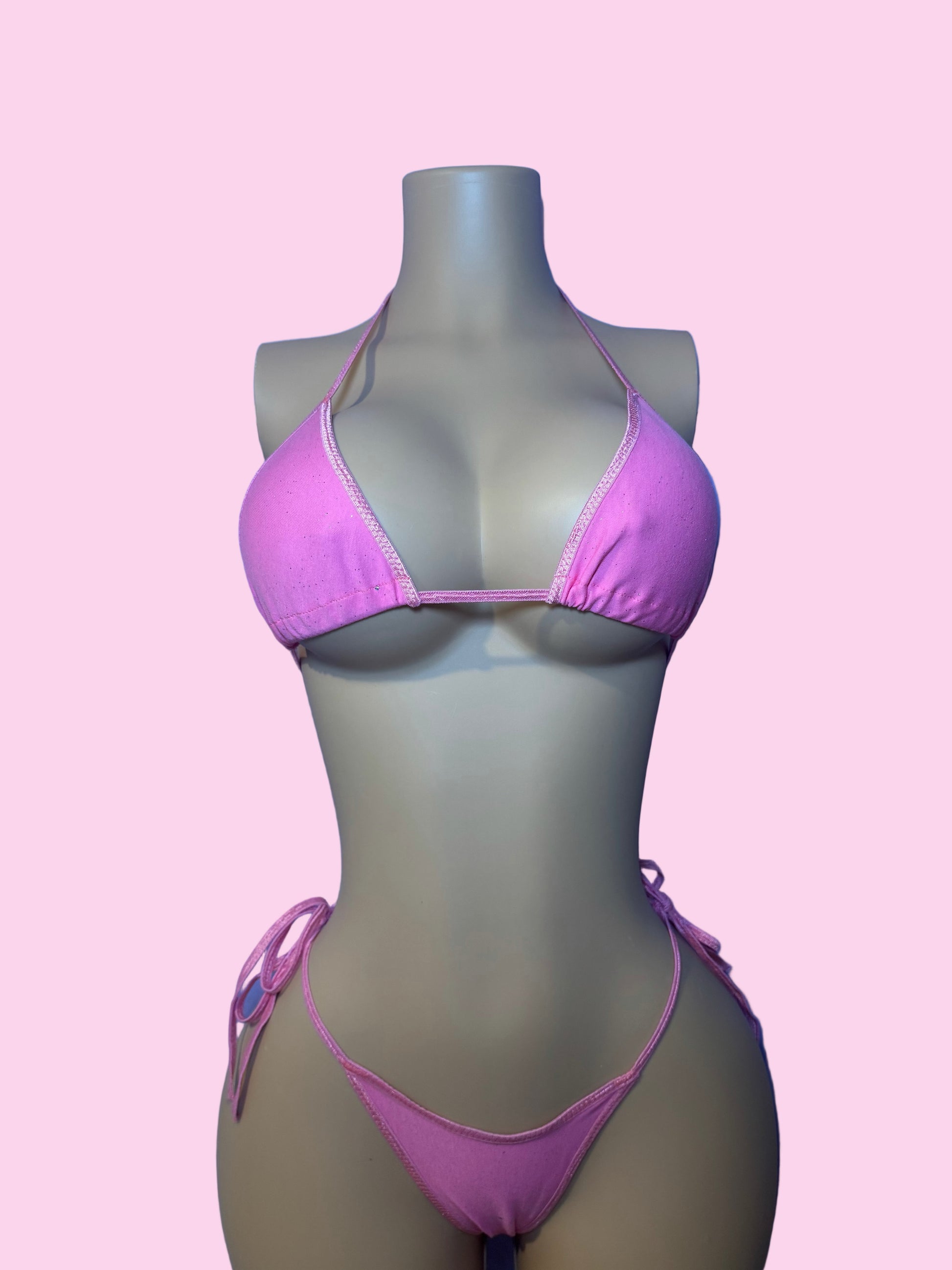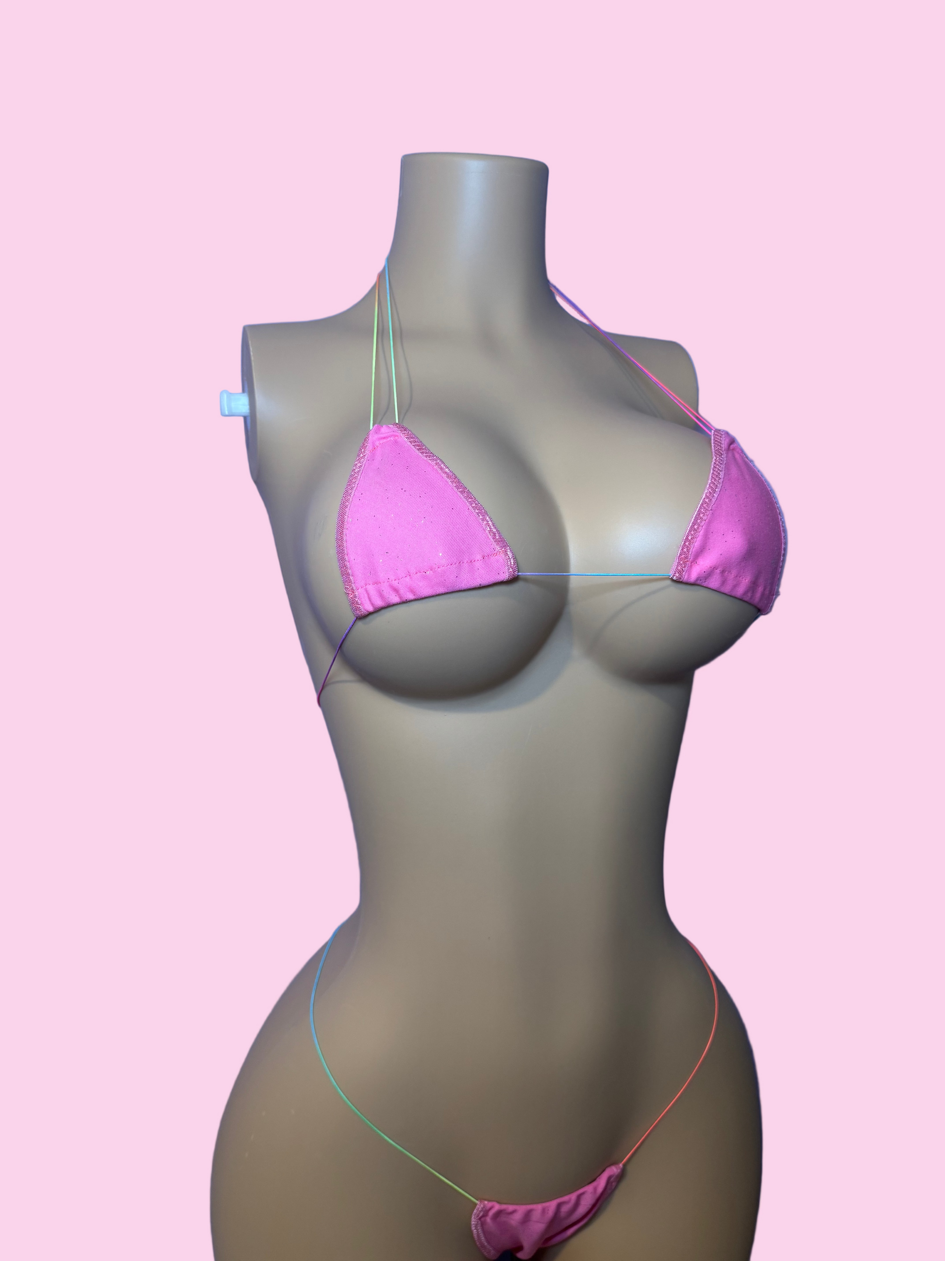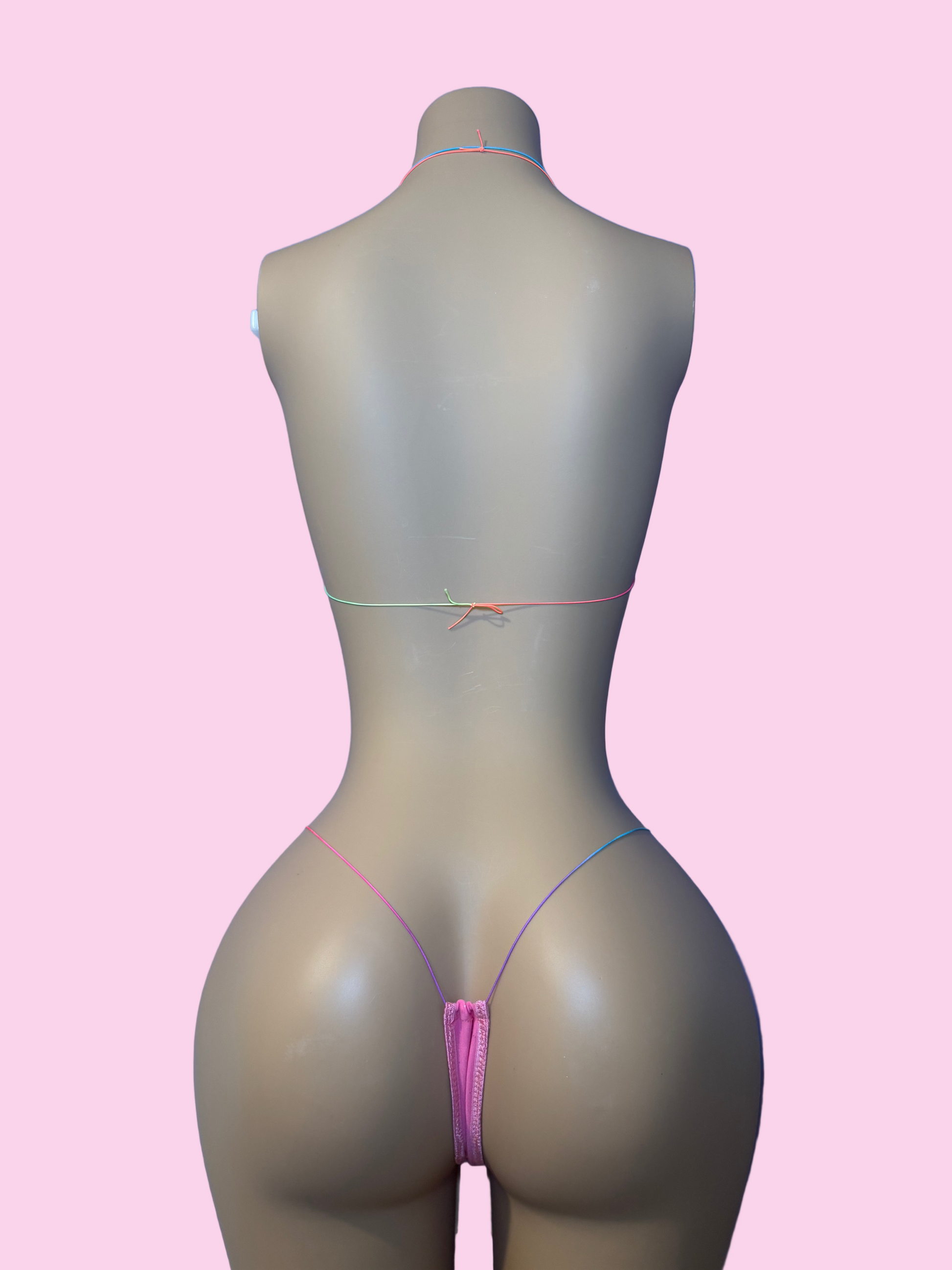 The Candice 'kini features multi-colored, durable, elastic string and is made from stretchy knit fabric with medium stretch.