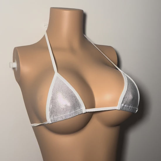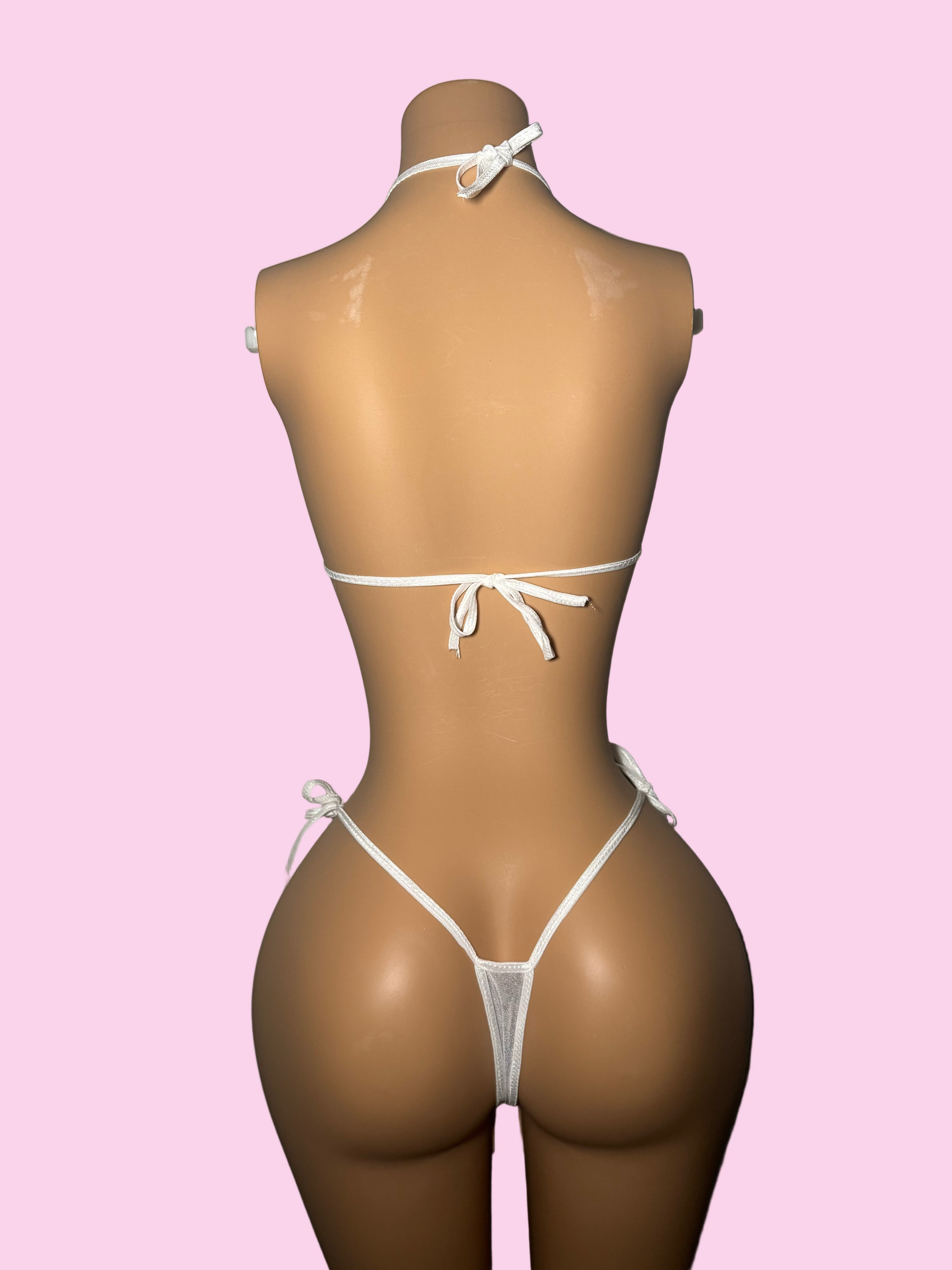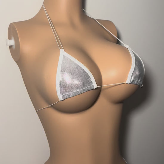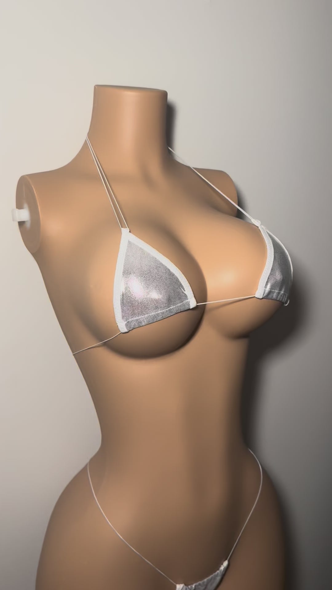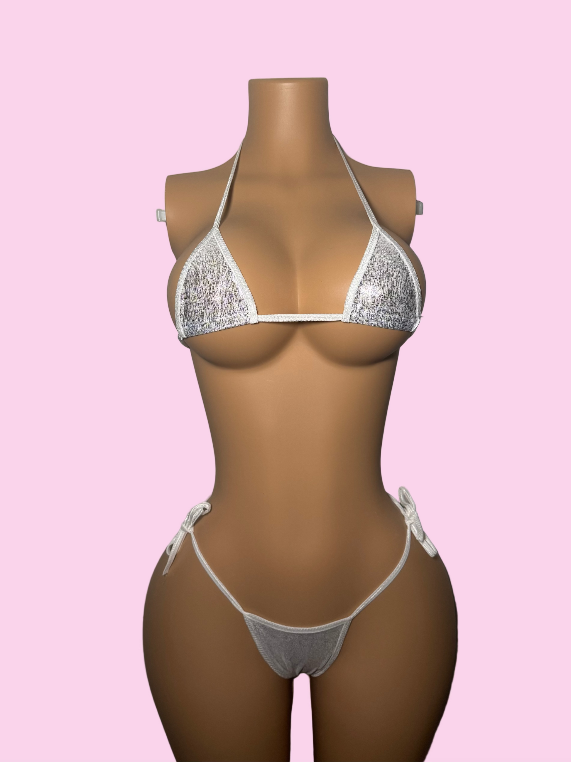 The Winter 'kini is a silver stunner, and money maker 🪙. Made from stretchy spandex fabric and durable elastic string.