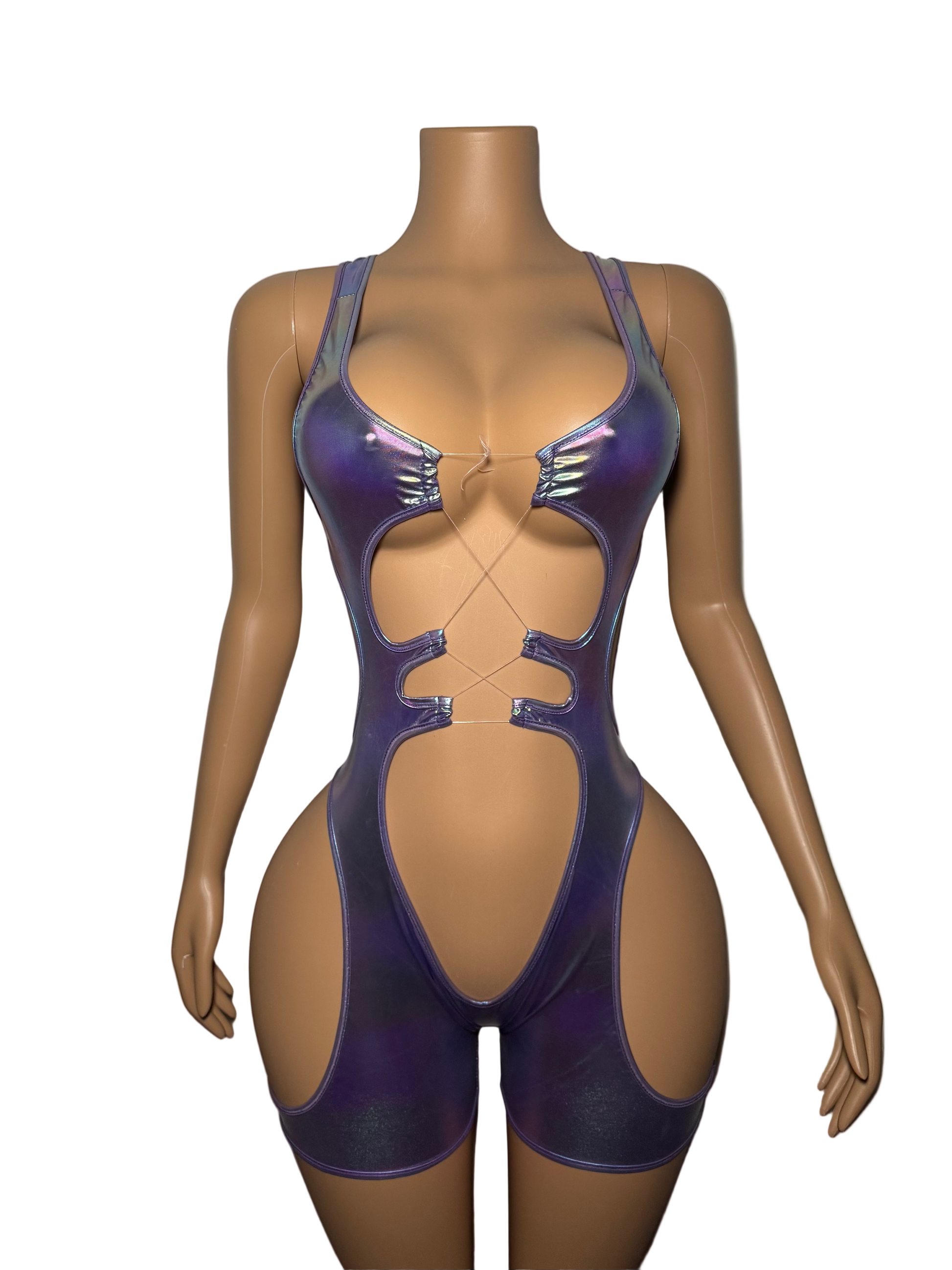 The Zenon bodysuit is made from metallic fabric and features built-in garters with a cross back strap. Adjustable from the front.